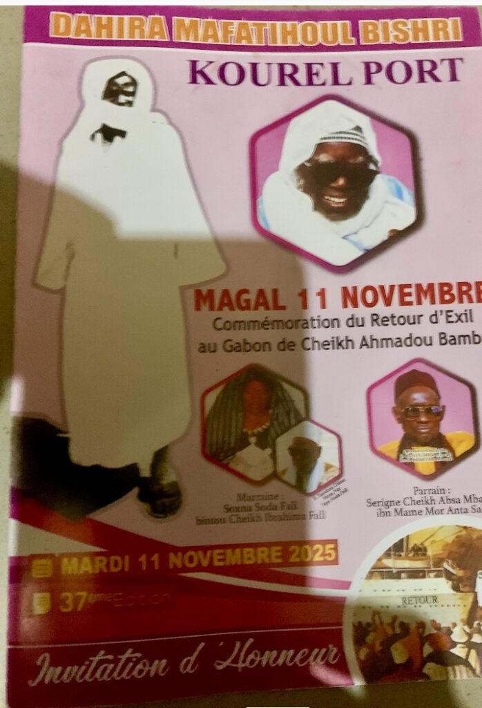 Pour cette 37éme édition qui sera célébrée ce mardi 11 novembre 2025 ,le Kourel port autonome de Dakar du DAHIRA Mafatihoul Bishri a décidé de la dédiée à Sérigne Cheikh Absa Mbacké Mame Mor Anta Saly et Soxna Soda Fall Bintou Cheikh Ibrahima Fall,respectivement parrain et marraine de l’événement.