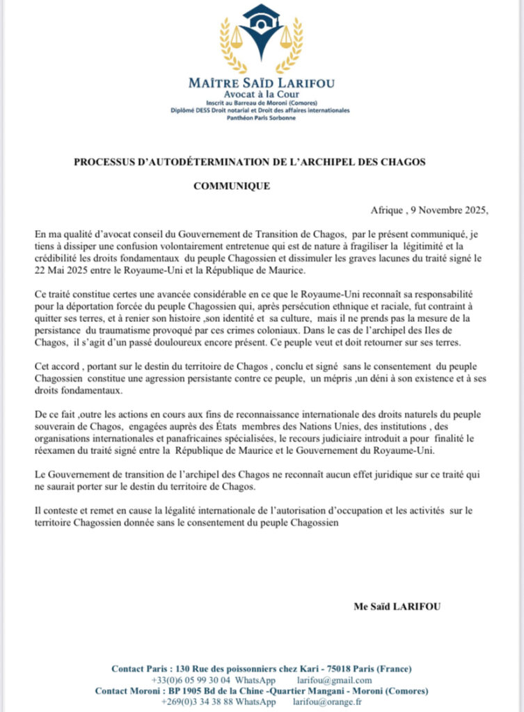 Maître Saïd Larifou avocat et conseil du gouvernement de transition de Chagos a vivement répliqué contre « les graves lacunes du traité signé le22 Mai 2025 entre le Royaume-Uni et la République de Maurice.Selon maître Saïd Larifou, ce traité même s’il constitue « une avancée considérable en ce que le Royaume-Uni reconnaît sa responsabilité pour la déportation forcée du peuple Chagossien qui, après persécution ethnique et raciale, fut contraint à quitter ses terres, et à renier son histoire ,son identité et sa culture, mais il ne prends pas la mesure de la persistance du traumatisme provoqué par ces crimes coloniaux ».