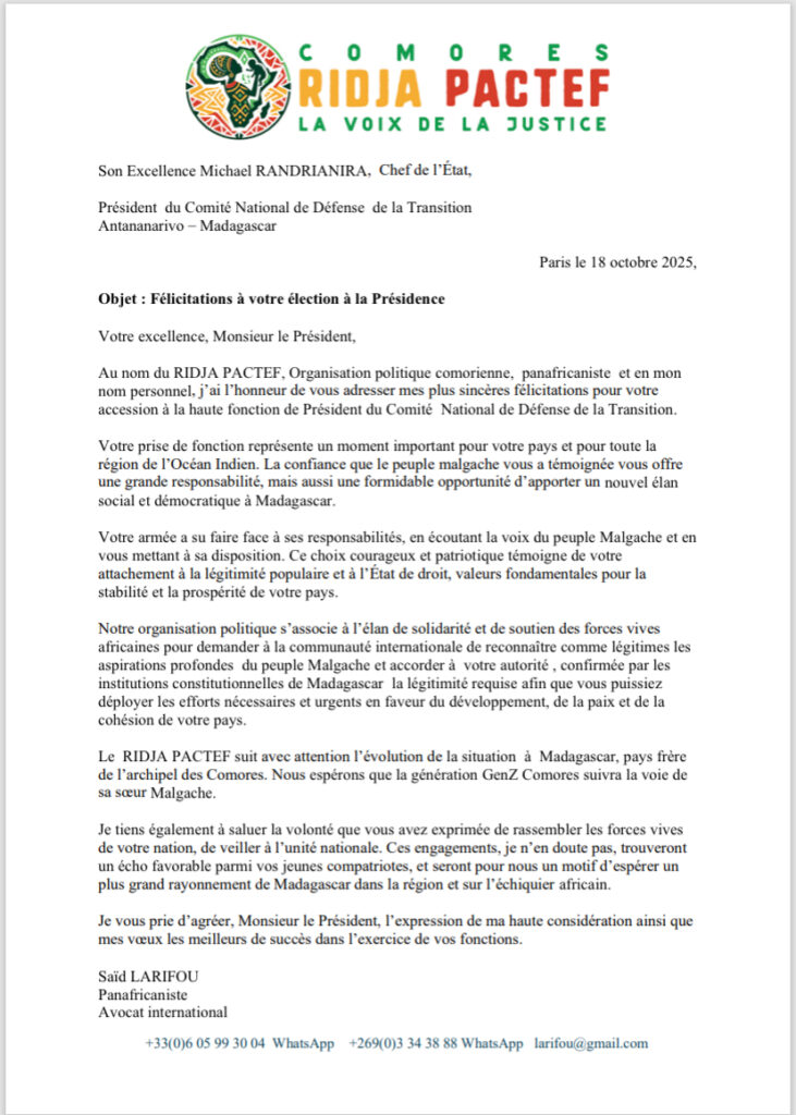 Maître Saïd Larifou président du parti RIDJA PACTEF adresse ses félicitations à Michael RANDRIANIRA, nouveau chef d’Etat au Madagascar.